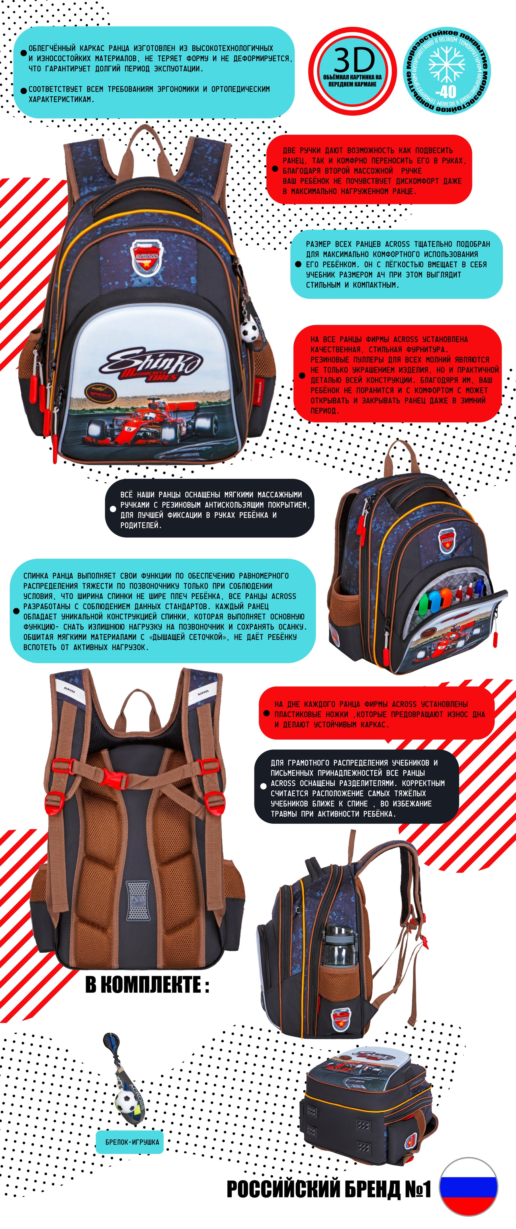 Модный детский рюкзак ACROSS с красивыми рисунками создан для учащихся начальных классов, первоклассников. Водонепроницаемый универсальный ранец с милым принтом оснащен жесткой спинкой и прочными анатомическими лямками с регуляторами по росту детей, снижающими нагрузку на плечи и спину. Нагрудный фиксатор и поясничная подушка способствуют равномерному распределению веса. В нем предусмотрена плотная усиленная ручка, вместительное отделение для тетрадей, книжек, карман для бутылки с водой, маленьких аксессуаров, предметов для школы. Светоотражающие элементы обеспечивают дополнительную безопасность в тесное время суток.